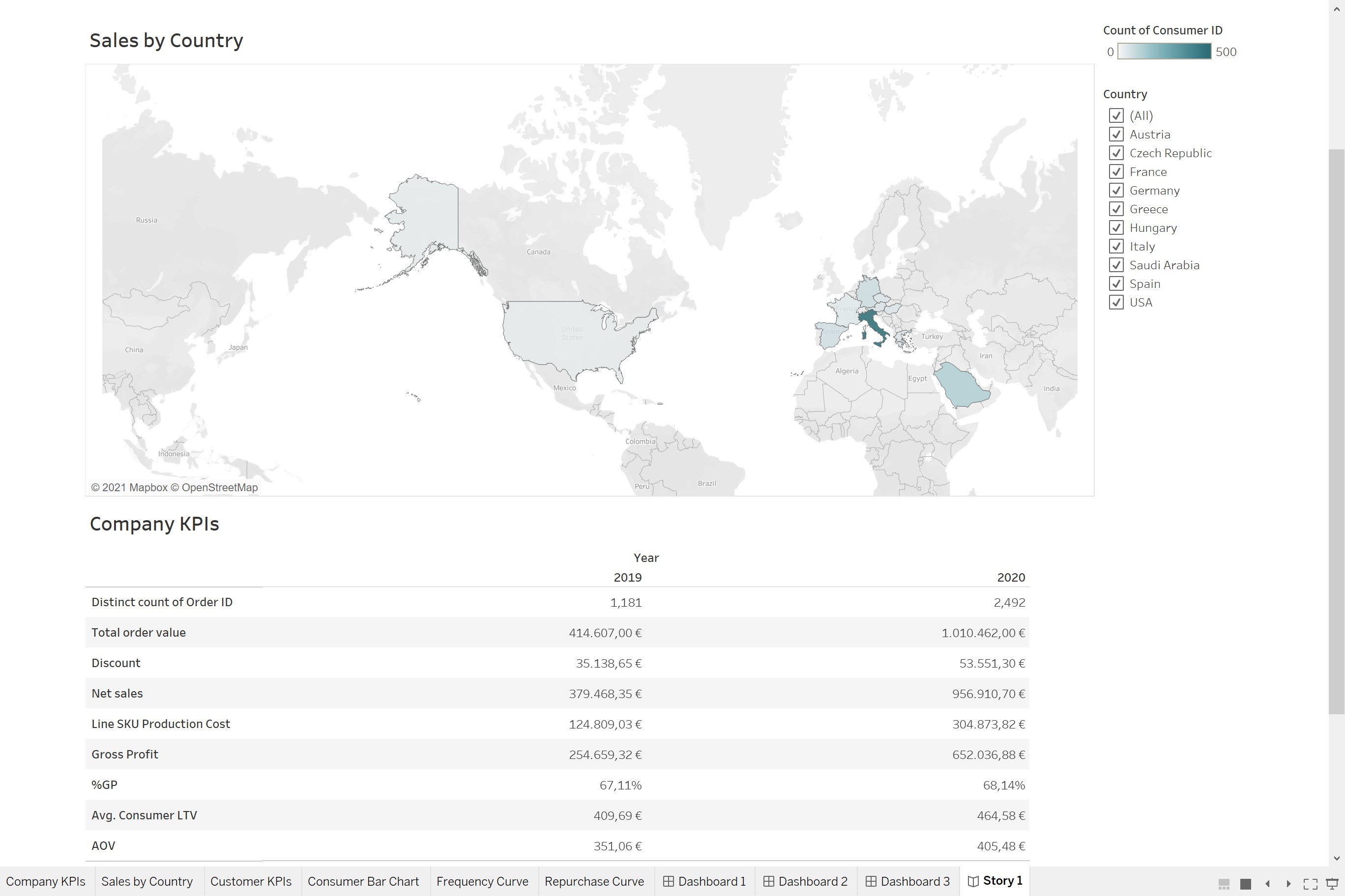The first part of the story shows company metrics. The story begins with the overview of the company KPIs. This is the number of consumers across countries. In company KPIs, we can see the important metric such as: Net Sales, gross profit margin, the number of orders as well as average of order value of purchases. As we can see, there is a 1% increase in %GD in 2020 compared to 2019 and in 2020 we made more sales compared to previous year, more than double the sales. Naturally it shows an increase in total order value discount in gross sales. The gross profit margin determines the growth.