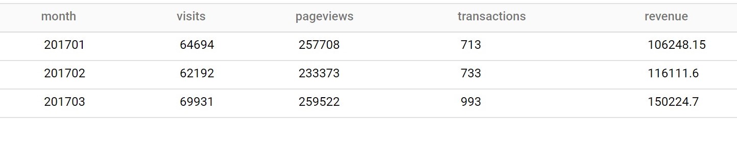 #1 total visit, pageviews, transaction, revenue for January, February, March 2017